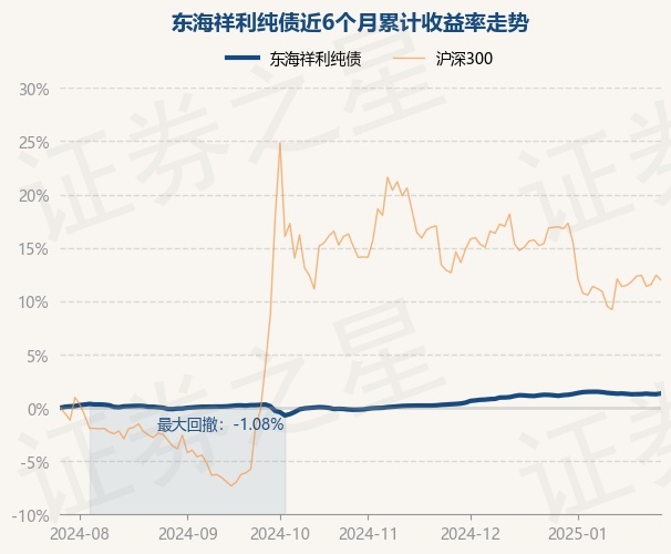 本站消息,1月27日,东海祥利纯债最新单位净值为1.0575元,累计净值为1.1625元,较前一交易日上涨0.07%。历史数据显示该基金近1个月上涨0.15%,近3个月上涨1.46%,近6个月上涨1.34%,近1年上涨4.51%。该基金近6个月的累计收益率走势如下图: